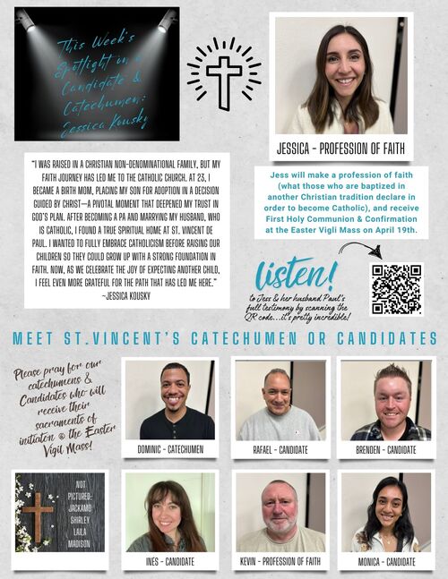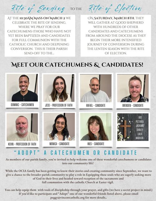 While the regular OCIA family has been getting to know the stories of our catechumens (now, elect) and candidates, and creating community since September, we want to give a chance to the broader parish community to play a role in equipping these souls who are eagerly seeking more of God in their lives and headed toward reception of the sacraments and full communion with the catholic Church at Easter Vigil.