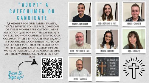 One you can do this is by "adopting" one of the candidates or elect and promising to pray for them daily. Let them know that you are praying for them, and perhaps send them a note of encouragement or a written prayer from time to time as we near Easter. We also need people to help contribute to a gift we want to make to give each of them at Easter -- we need those who can shop, those who can create and also funds to make it happen. If you are able to participate in any of those ways or just want more information, please click here and sign up for emails about "adopting" one of our wonderful new parishioners who are on this journey of deepening conversion.